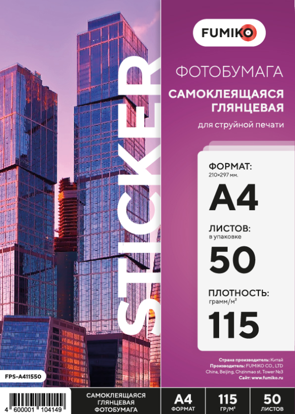 Фотобумага FUMIKO глянцевая самоклеящаяся 115г/А4/50л