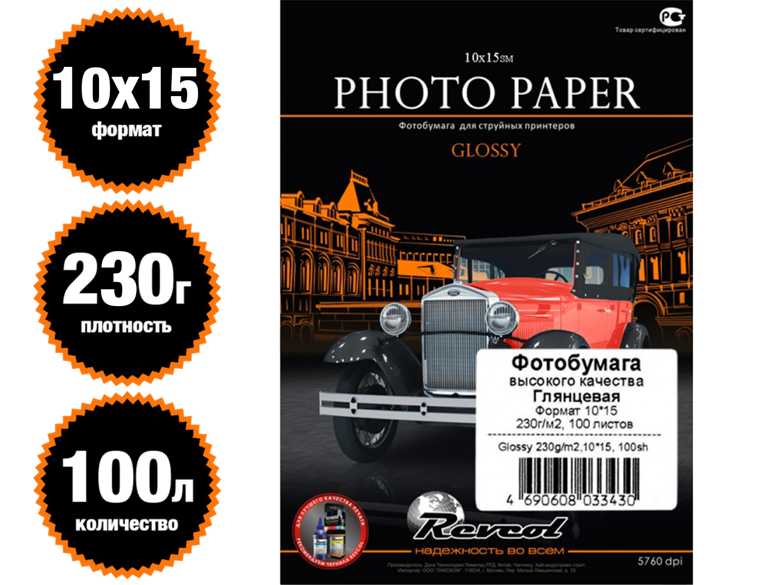 Плотность230 грФомат10х15ПоверхностьглянцеваяКоличество листов100ОдносторонняяестьБрендREVCOL